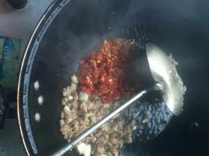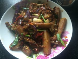 肉末弄到一边,放入剁椒(糟辣椒),然后倒入茄子翻炒,放调料,酱油,醋,蚝油少许