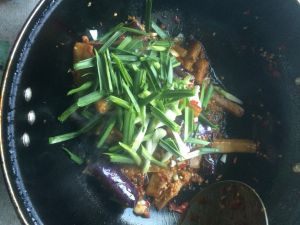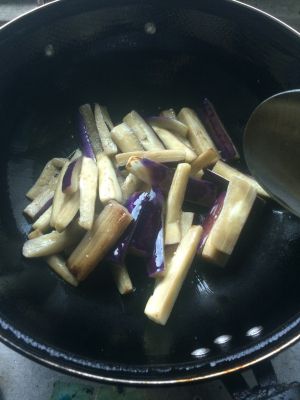 加入郫县豆瓣炒出红,加入茄子、少量盐、生抽炒匀