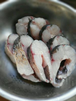 鱼段洗净从脊背处劈开,切成2cm左右厚片。