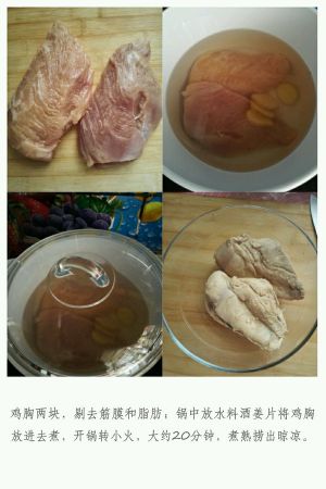 鸡胸剔去筋膜和脂肪,放入锅中,锅内加水和料酒姜片,盖盖大火煮开改小火,煮20分钟左右,将鸡胸煮熟捞出晾凉。
