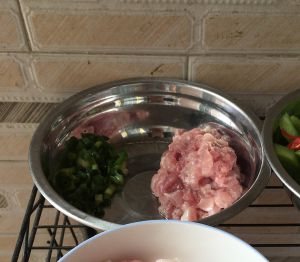 把肉丁或肉馅腌15分钟左右,用盐、五香粉、鸡精、或是喜欢吃烤肉酱什么的,放点。随意放。抓拌均匀。