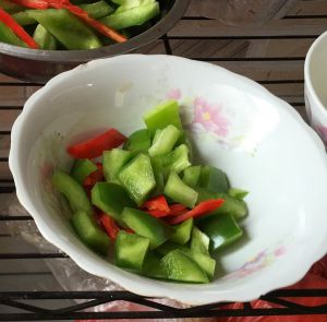 青椒切丁,红椒切丝