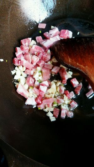 炒锅放油,把蒜蓉炒炒出香味,再下肉丁,炒散。起个定型作用好像是