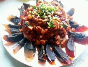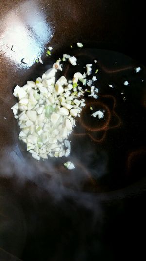 这个时候准备下蒜蓉,葱末,再用勺子调点淀粉、水、生抽、老抽(为了上色)糖。调匀。这些调料主要看个人口味。也可以出锅前根据味道再添加。
