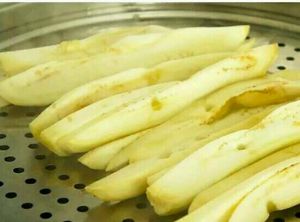 把茄子切好后放蒸锅蒸5分钟左右。水开了再蒸。不然水里的氯气都被食物吸收了,网上说得,我就这么做了,是否正确不知道