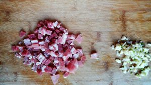 把肉切成丁,蒜瓣切成蒜米