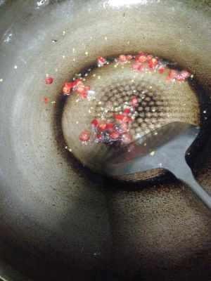 锅里加油热后炒辣椒,炒到有红油出来