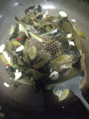 辣椒、蒜头,葱白,姜过油后加入洗干净挤掉水分的酸菜,略炒一两分钟然后加入水