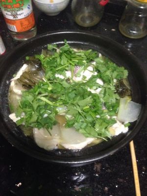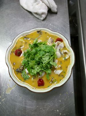 水煮开后再煮五分钟让酸菜味道尽量散发出来,之后加入鱼片。(鱼片事先要用生粉腌制一下。)鱼片熟后散上葱花和香菜