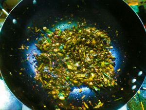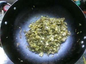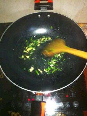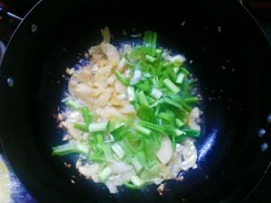 No.6.倒入适量的食油加热后放入剩下的青蒜、芹菜和切好的酸笋加入适量的食盐一起翻炒