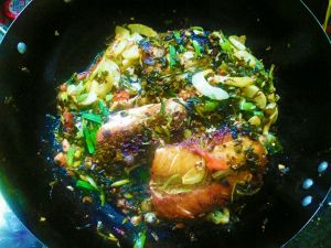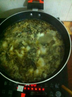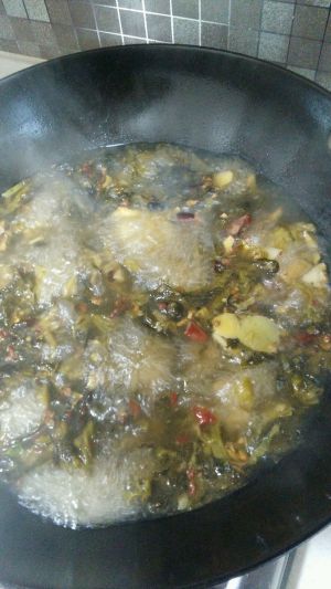 倒入酸菜炒香,加入好人家自带的一包调料,再放入鱼头炒1分钟。