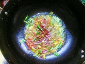 锅烧热放油烧五成热放花椒 辣椒 姜 蒜片葱段爆香