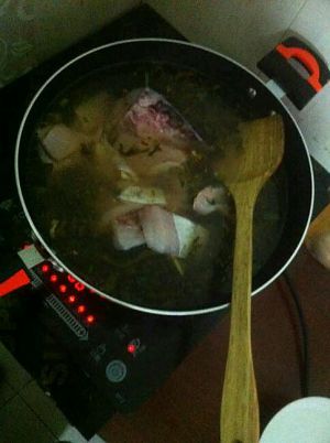 把鱼头,鱼尾巴啥的加进去。加水炖开啦!