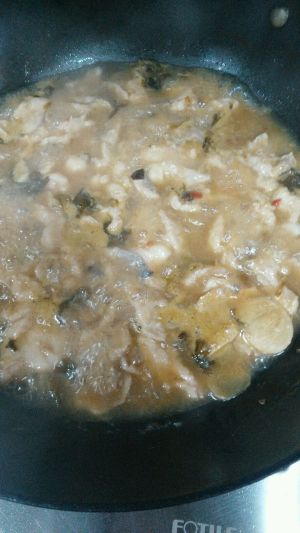 酸菜捞出后将鱼片一片一片放进汤里煮开