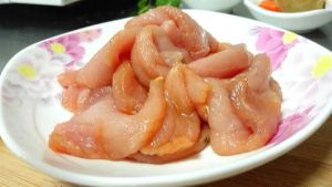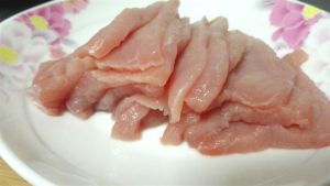 里脊肉洗净后,切成3-5毫米厚的片,加入盐和料酒抓拌均匀,腌制15分钟。