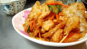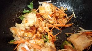 将锅刷净,放入白米醋,白糖(可多放),小火熬制,待变粘稠,有些焦黄色的时候放盐,味精,葱姜胡萝卜丝,香菜,熬到它们变软,关火然后将炸好的肉倒入,快速翻炒出锅,否则就不酥脆了,要是会翻勺就更棒了!如果怕失败,也可将熬好的汁浇到肉上!