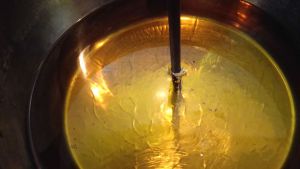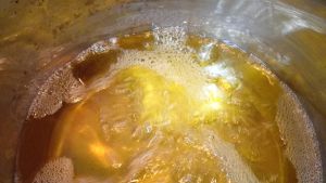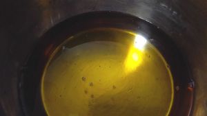油加热至五、六成热,插入筷子,筷子周围起气泡时表明油温已达到