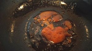 将糖炒至变色,加入热水、盐和水淀粉,熬至粘稠