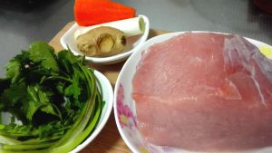 将新鲜的里脊肉切成大片,稍微厚一些,葱,姜,胡萝卜都切成丝,蒜切片!