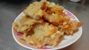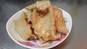 炸肉片,没拍图,一共炸2次,第一次:油温高一些,一片一片摊平放到油锅里,肉片定型后在翻动,否则粘筷子,肉片也会粘在一起,肉片全部炸好后第一次复炸约1分钟就捞出来。我炸的太久了,肉片都干了,感觉是第一次火不够大,定型用了好久,下次调整一下