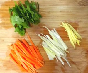 胡萝卜、葱、姜切丝,香菜切成段备用