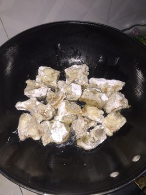 腌制好的排骨拿出洗干净(注意,腌制排骨的调料不要倒掉,留着备用)放入生粉碗里裹上生粉