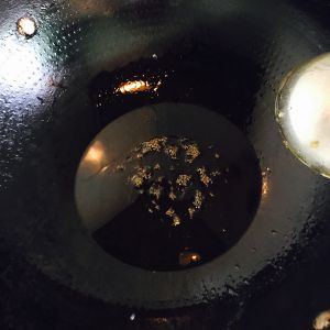 锅内放少许油中大火烧热,下沥干水的排骨翻炒3分钟至变金黄色出油