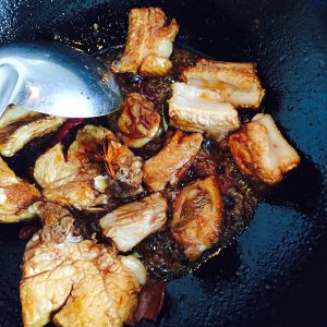上色后放一大碗水,没过排骨,小火炖至20分钟左右大火收汤。出锅