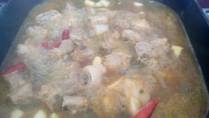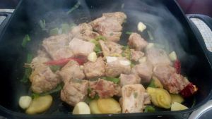 油热后放花椒大料排骨翻炒,同时放红烧酱油,糖(要多放)料酒盐等