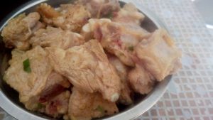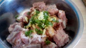 排骨洗净加入葱 姜 胡椒粉 料酒 酱油腌一小时
