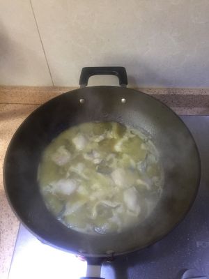 继续大火烧汤,直接用手一片片放入码好味的鱼片,让鱼汤淹过所有鱼片,一分钟后关火。盖上锅盖焖两分钟。
