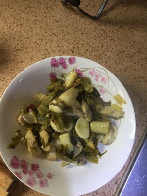 热锅下油,放葱段,姜片,蒜片爆香,加入码好味的鱼头和鱼骨,翻炒片刻,倒入酸菜丝再次小心翻炒,炒出香味后,倒入开水淹过鱼头,大火煮沸,盖上锅盖焖煮十分钟,鱼汤变浓。这么重要的一步,我忘了照像了……
