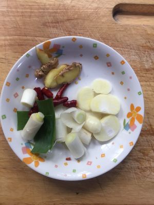 把鱼头~鱼大骨,放入凉水中,放入姜,香叶~煮开~
