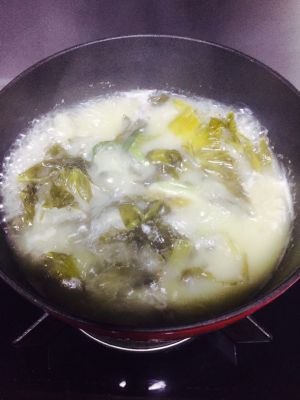 炒香后的酸菜倒入鱼汤 过程中尝下味道 根据自己口味调