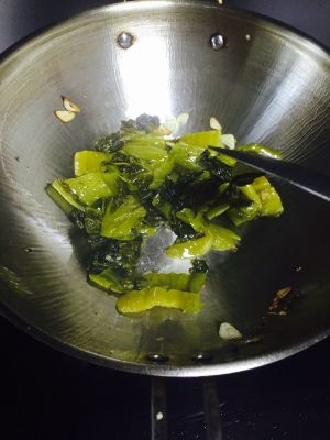 看汤差不多的时候清洗酸菜 起油锅 放蒜姜煸香后加入酸菜炒香 喜欢辣的朋友可以放辣椒哦 因为有多宝 所以我们没有放