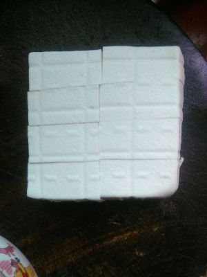 豆腐切开小块,如图大小,拿一块,在四边画个框(可防止一会弄破,动作要轻柔),如图