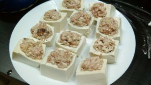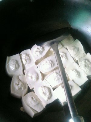 把豆腐切成2-3cm的方块,在中心用小勺挖成小洞(切记:别挖穿了,或者别挖裂了) 把面粉过筛到豆腐的小洞里(让肉馅与豆腐更好的粘合,而且高筋面不容易结块)