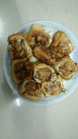 把酿好的豆腐放入八成热的油锅里煎,记得千万不要翻煸,这样豆腐容易碎;