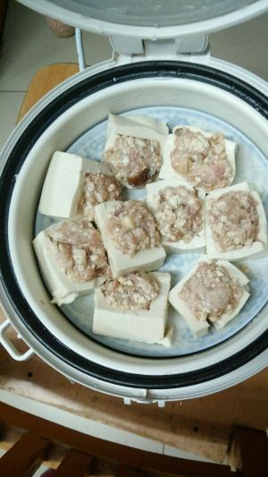 将调好的肉馅满满的塞进豆腐中,因为喜欢肉所以将豆腐填的满满的,在周围也多放了一点让肉和边缘更贴合