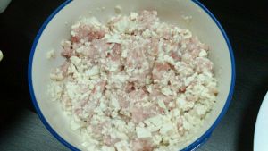 挖出来的豆腐不要浪费和剁成肉馅的五花肉搅拌在一起
