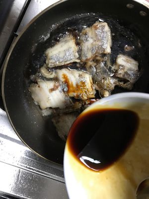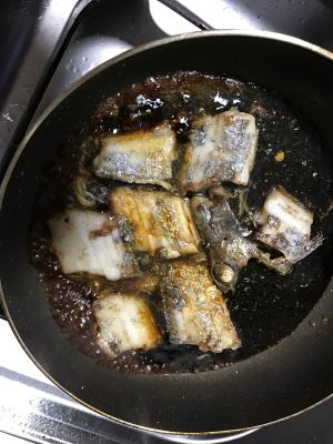 倒入小半碗水,然后盖上盖子中小火煮,中间给带鱼翻个面,继续让它收汁