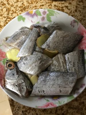 带鱼去内脏,洗净,切段。放入料酒和姜腌制一会