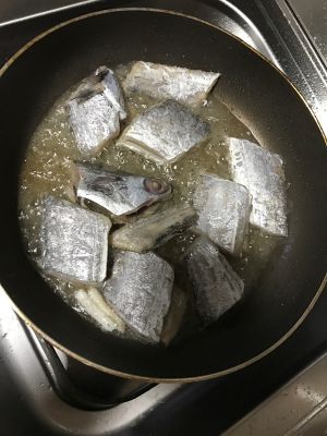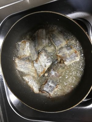 放入腌制好的带鱼煎,小火煎比较好,火大容易糊掉
