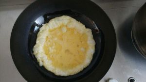 开火,锅热放油,把鸡蛋打散倒入锅中煎。