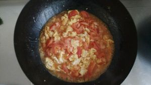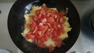 鸡蛋煎熟后倒入西红柿,加入盐和少少酱油翻炒。