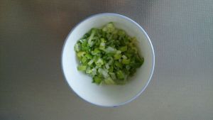 准备好主材料,因为家里没有小葱了,就用大葱叶代替。