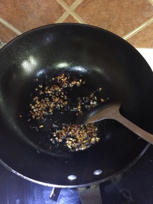 锅里再次热油放入蒜末煸炒至闻到蒜香。