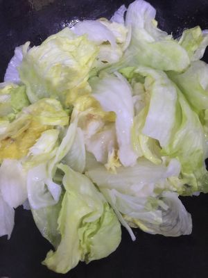 将圆生菜用手撕成片状,锅里烧热植物油(小火),将圆生菜炒软至出水,过程中放少许盐。