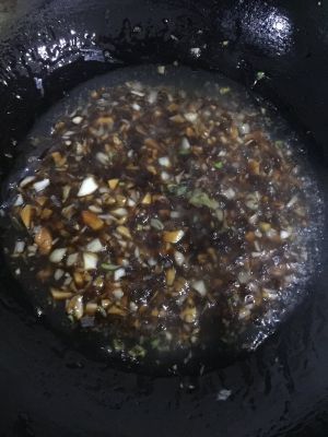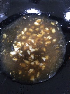 热油,将蒜切成小块,放入热油锅中爆炒,然后把调好的酱汁,倒入油锅中。