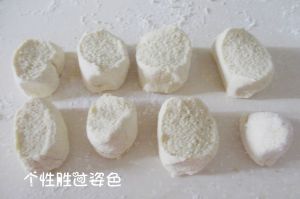 馒头切丁,打入鸡蛋拌匀,滋润10分钟。